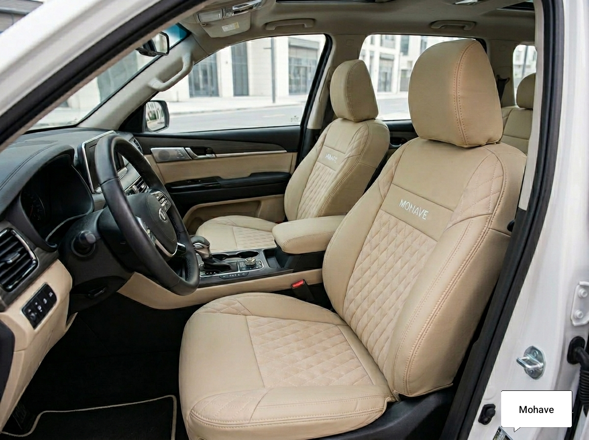 دوشمة كيا موهافي سبعة راكب توفر لك مزيجاً مثالياً بين الأناقة والمتانة. بفضل الدمج بين الجلد الفاخر والقماش المتين، تقدم هذه الدوشمة مظهراً عصرياً يناسب فخامة سيارة كيا موهافي.